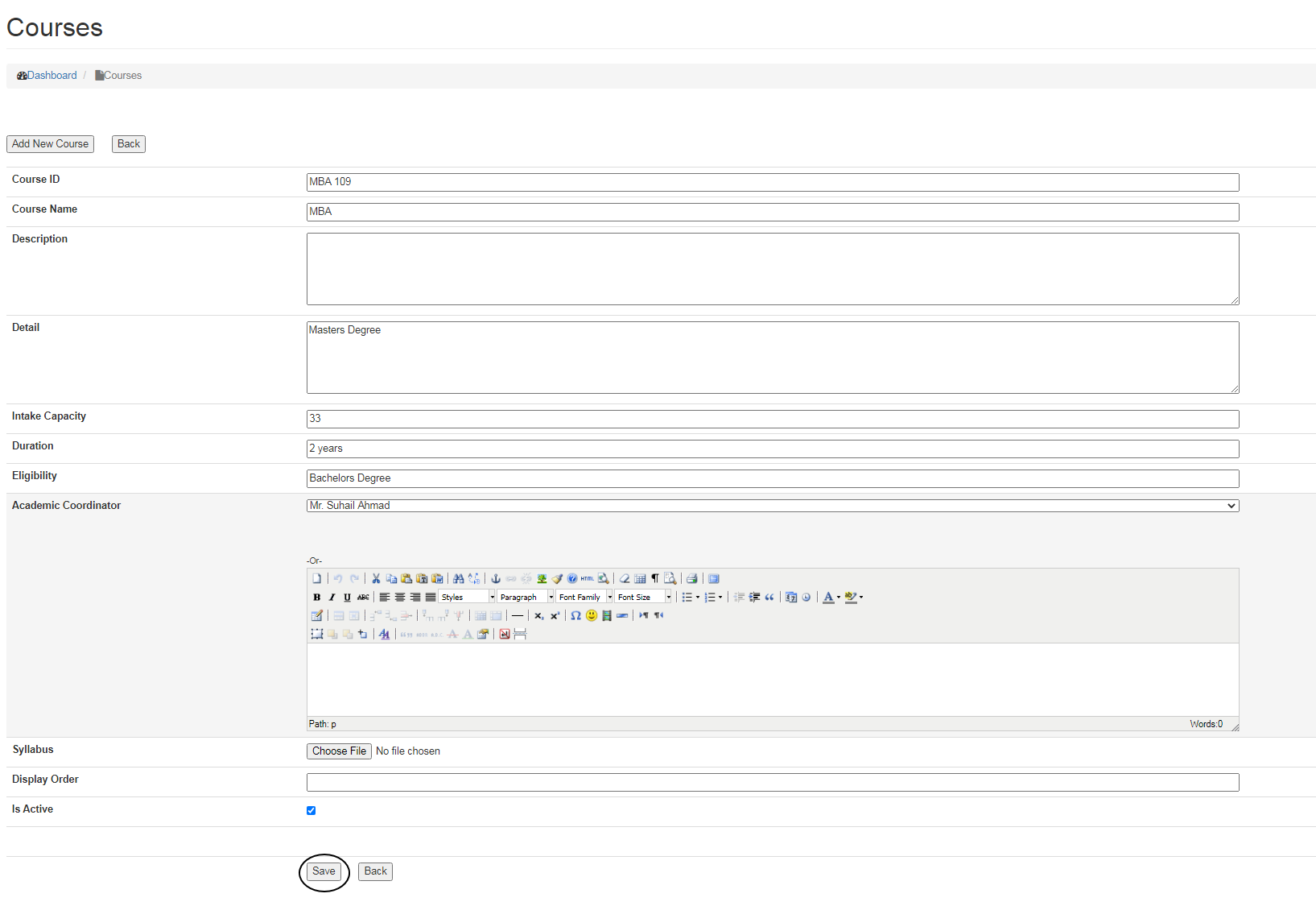 Once clicked on Add New Course button, it will take you to the page wherein  you can enter course details which includes: