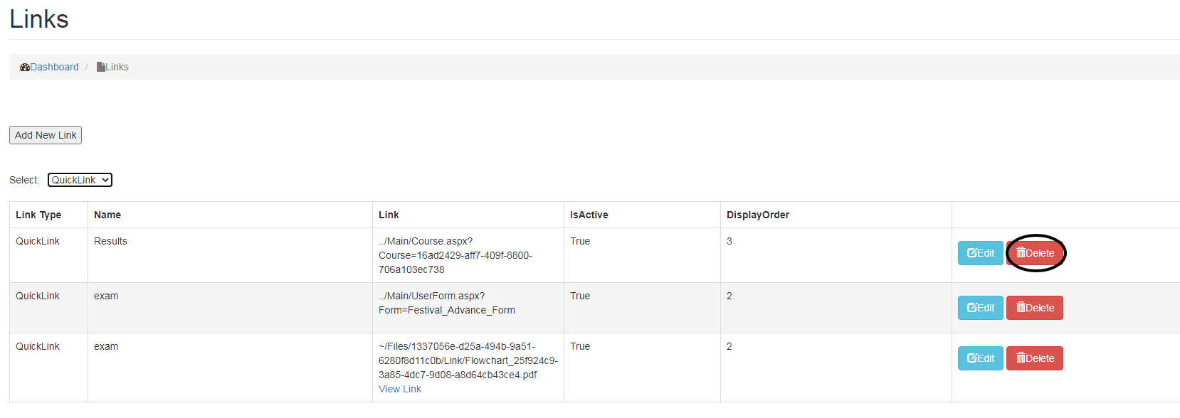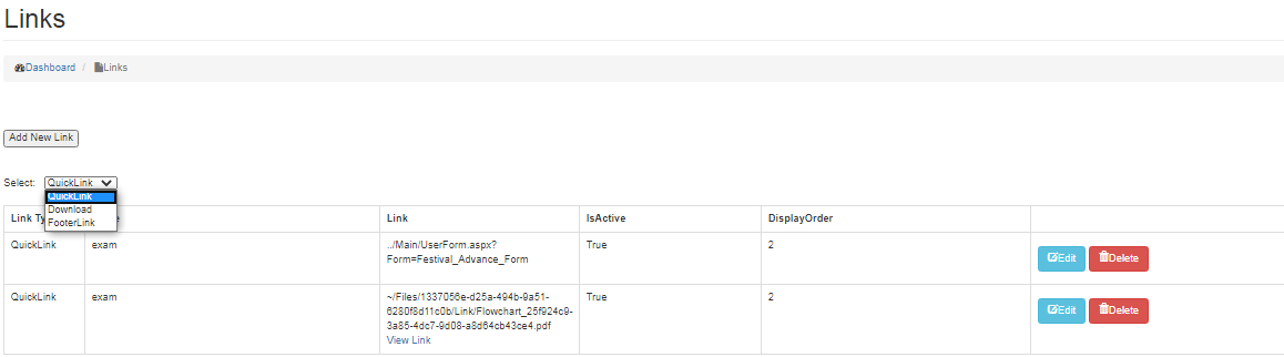 Select displays links which have been added to the website, by Choosing desired link (Quick Link, Download and Footer Link) from the drop down menu.